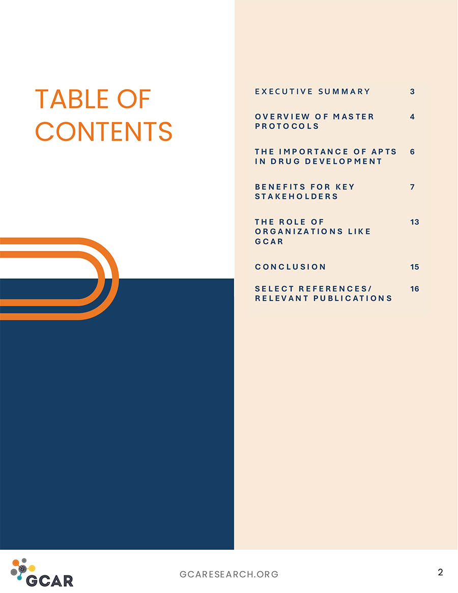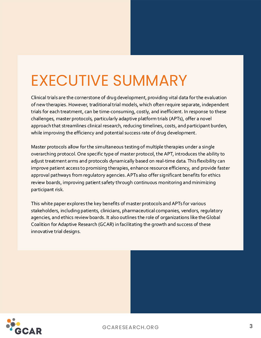 Master protocols revolutionize clinical research by enabling multiple therapies to be tested under a single, flexible framework. This approach accelerates patient access to promising treatments, optimizes resources, and streamlines regulatory approvals. Our white paper explores the key benefits of master protocols and adaptive platform trials (APTs) for stakeholders across the healthcare ecosystem—including patients, clinicians, pharmaceutical companies, and regulators. Discover how organizations like the Global Coalition for Adaptive Research (GCAR) are driving innovation in trial design to transform the future of medicine.